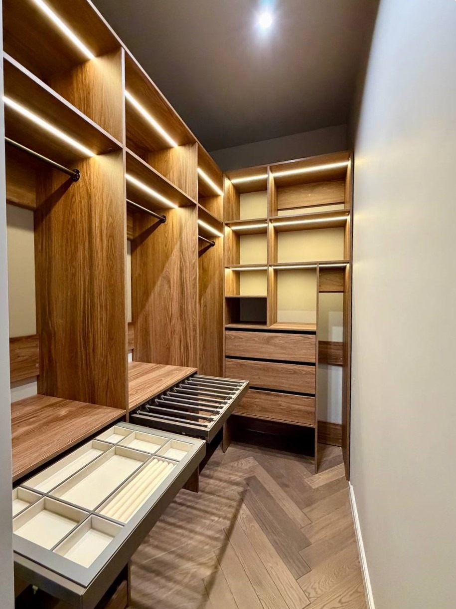 • Можно гибко настроить внутреннее наполнение — полки, штанги, корзины, ящики под конкретные вещи.