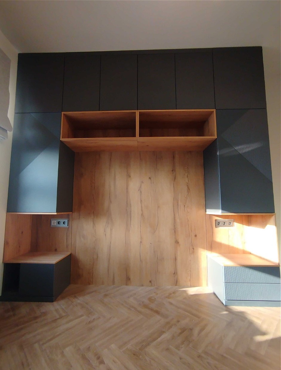 Кровать с подъёмным механизмом поставили по центру стены справа от входа. Это дало понятную ось комнаты, а под кроватью появилось дополнительное место для вещей.