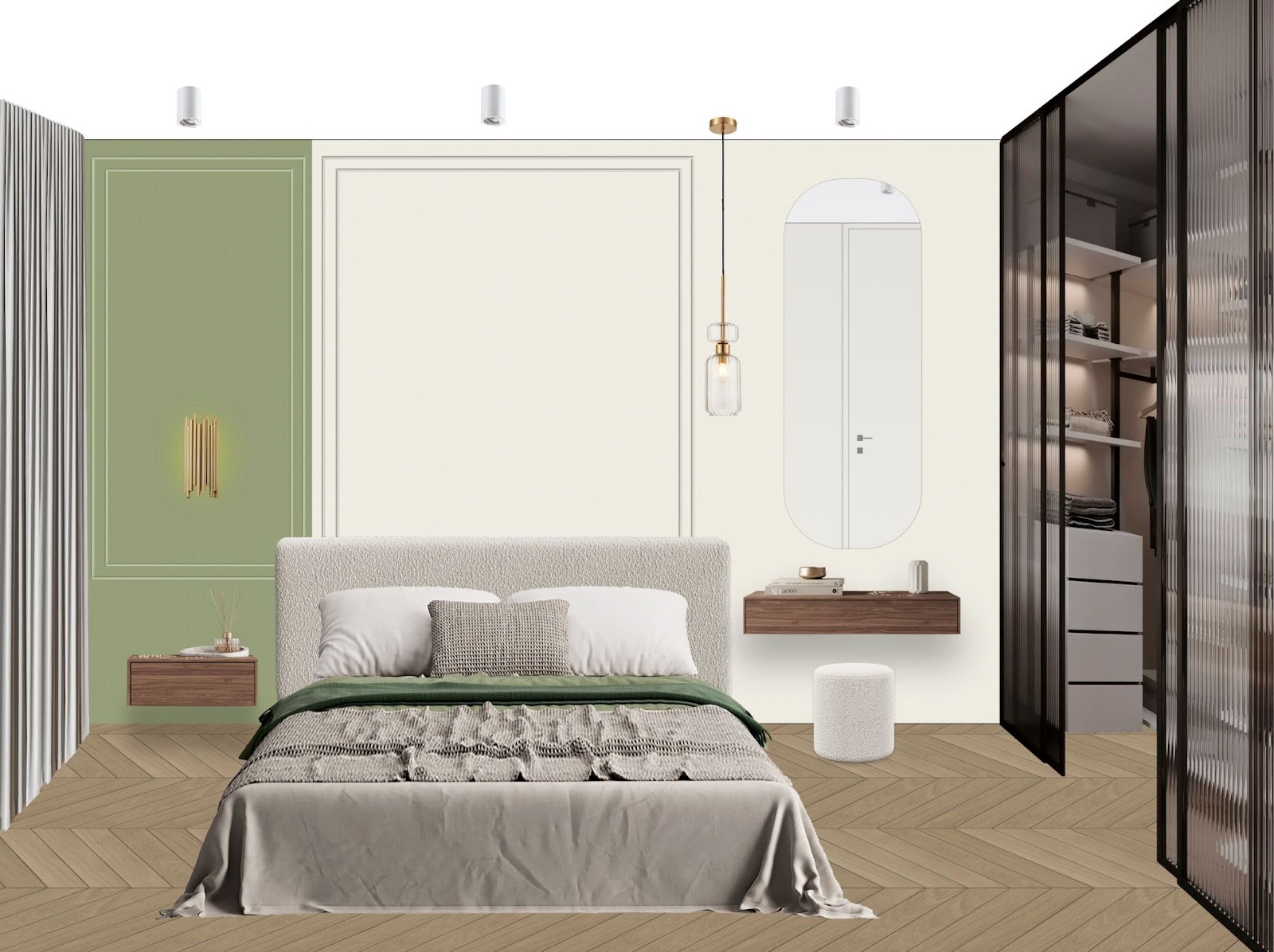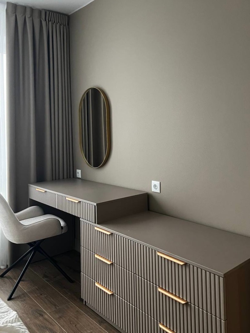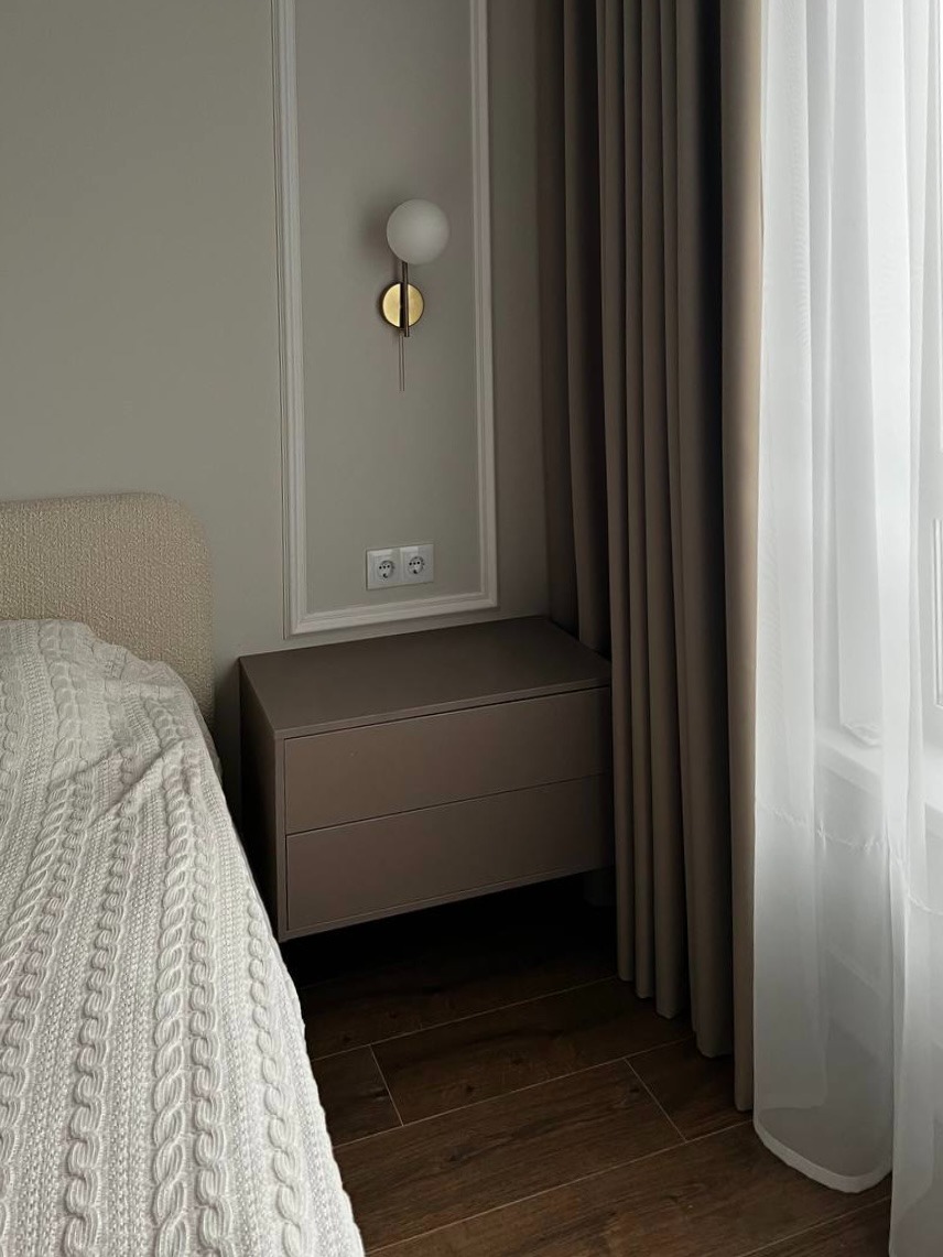Поэтому до начала работы Анастасия всегда уточняет базовые вещи: кто будет жить в комнате, что люди делают в спальне кроме сна, сколько вещей нужно хранить, есть ли сезонное хранение, какие утренние и вечерние привычки. Кому-то достаточно поставить тумбу рядом с кроватью, а кому-то нужна полноценная зона с зеркалом и светом.