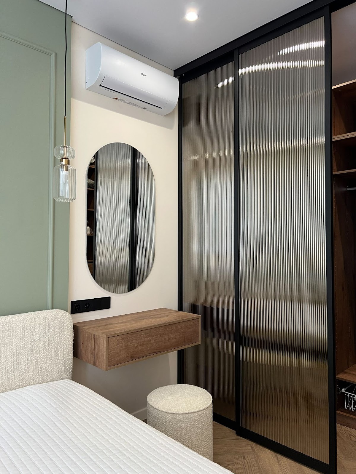 Туалетный столик стал отдельной зоной с зеркалом и подвесным светильником.