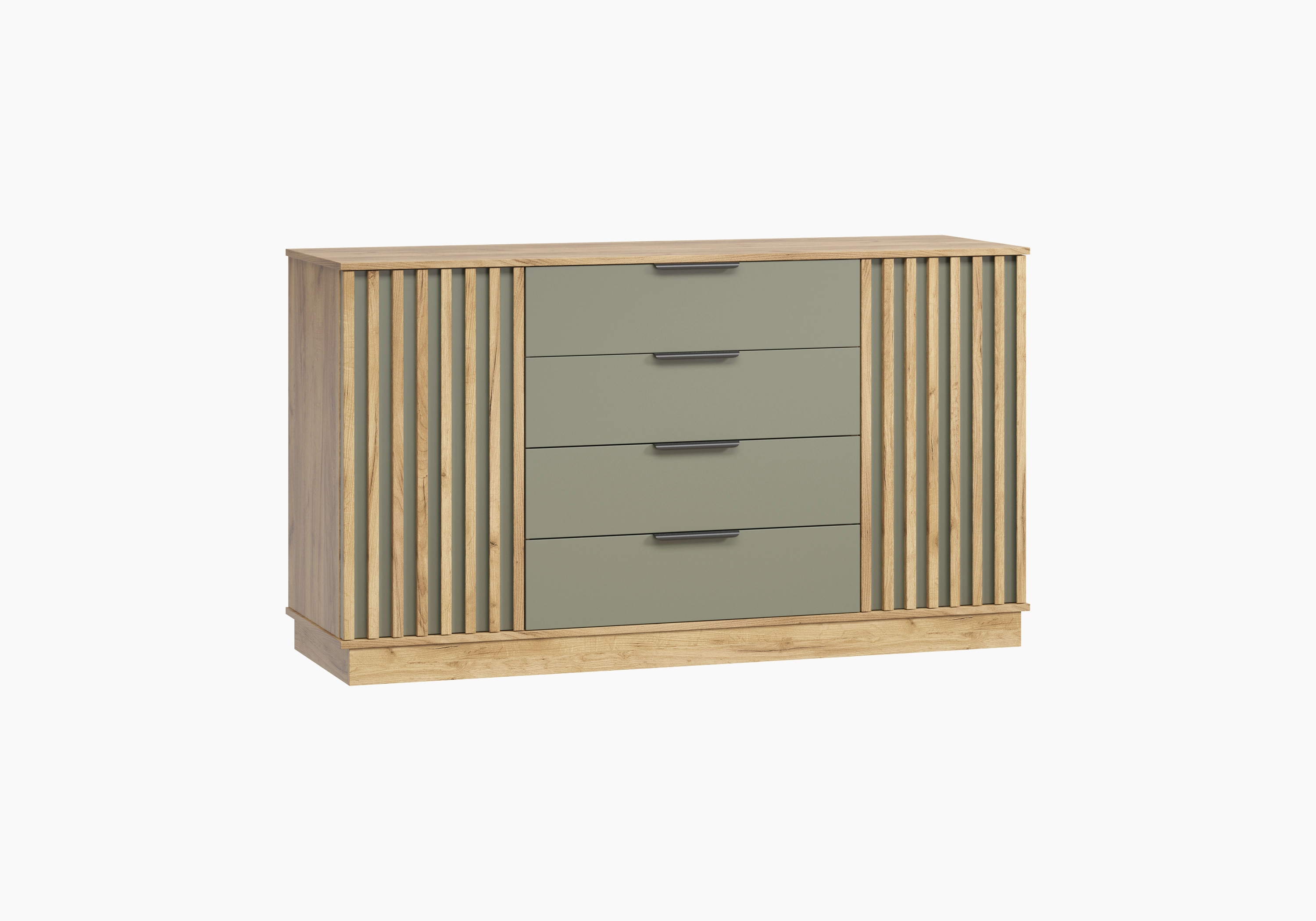 Металлические ручки обеспечивают комфортный захват и не собирают царапины. Объемные планки из профиля МДФ с торцами в черной эмали приковывают взгляд и зрительно вытягивают комод в высоту. На створках они дополнительно выполняют функцию ручки.
