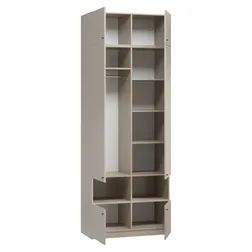 Комплекты постельного белья и сезонные вещи удобно разложить в антресоли и на полках распашного шкафа. В платяных отделениях встроены крепкие штанги для вешалок. Нижние распашные секции вместят обувь и мелкие бытовые приспособления.