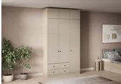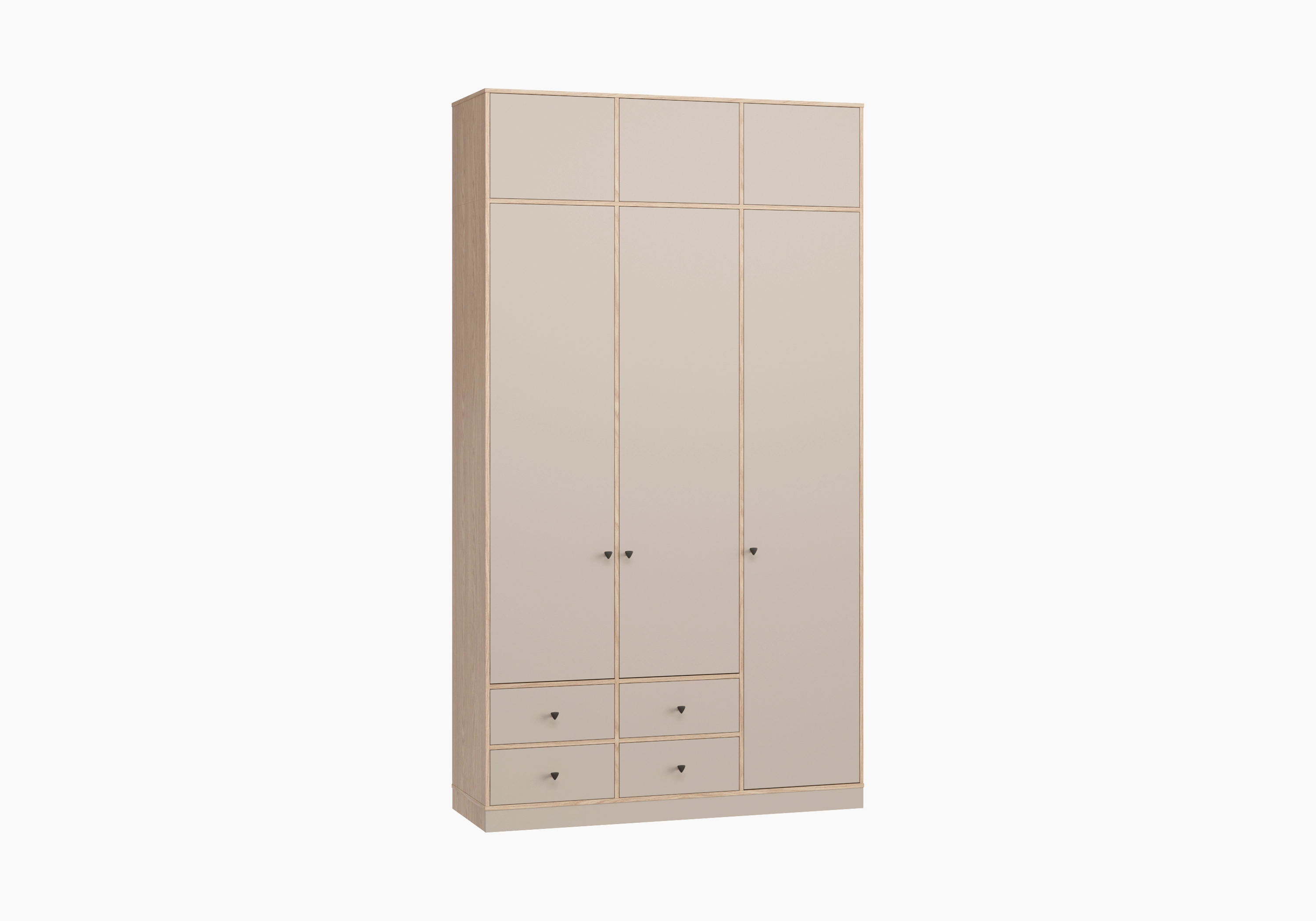 Треугольные металлические ручки представлены в трех вариантах: черный, хром и белый. Особенностью коллекции являются вкладные фасады. Антресольные дверцы открываются легким нажатием за счет системы push-to-open. Закрытый цоколь облегчает процесс уборки и делает мебель более устойчивой.