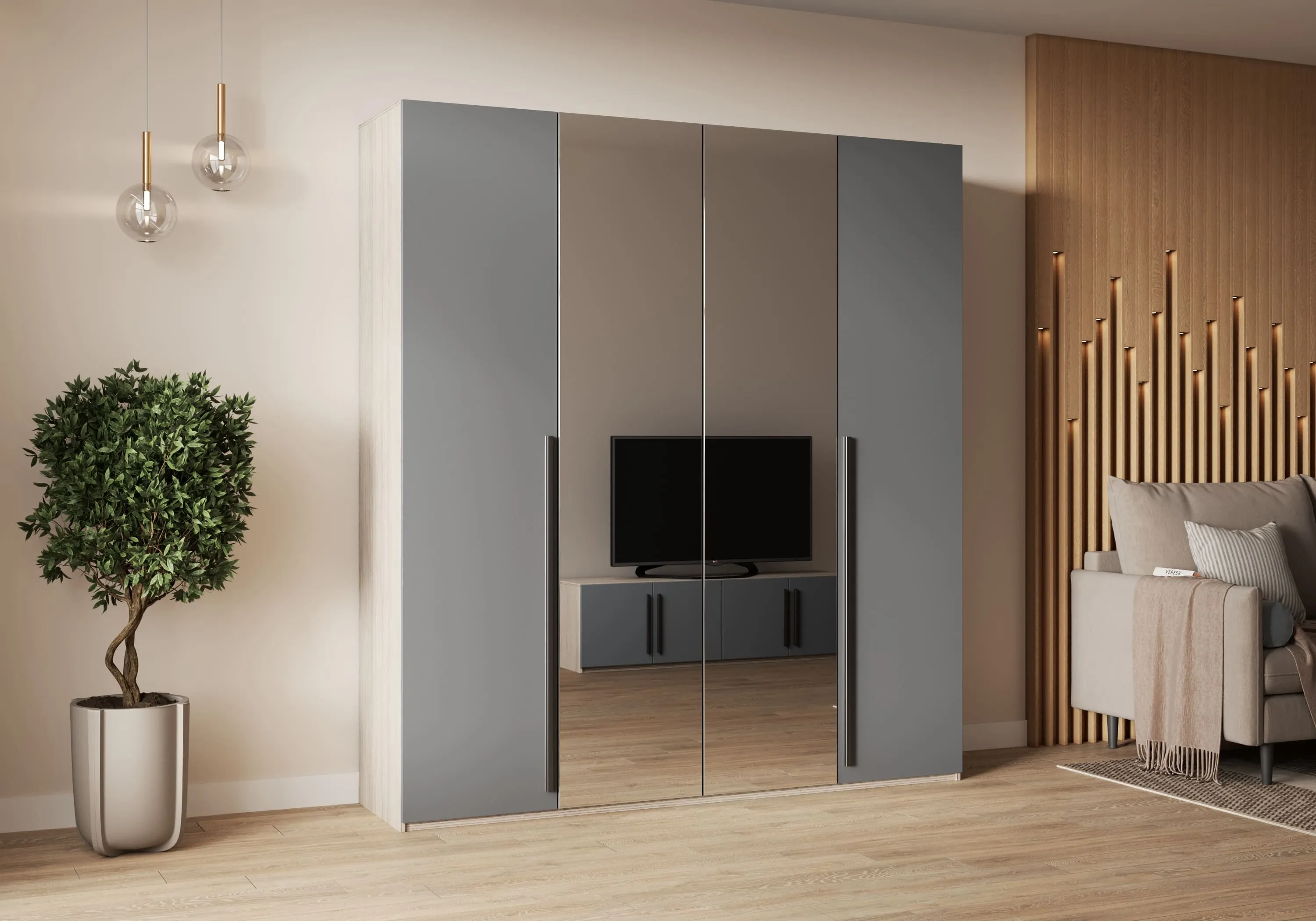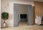 Система хранения четырехдверного шкафа состоит из двух платяных отделений со штангами и верхними небольшими нишами и центрального отсека со штангой, верхними и нижними полками.