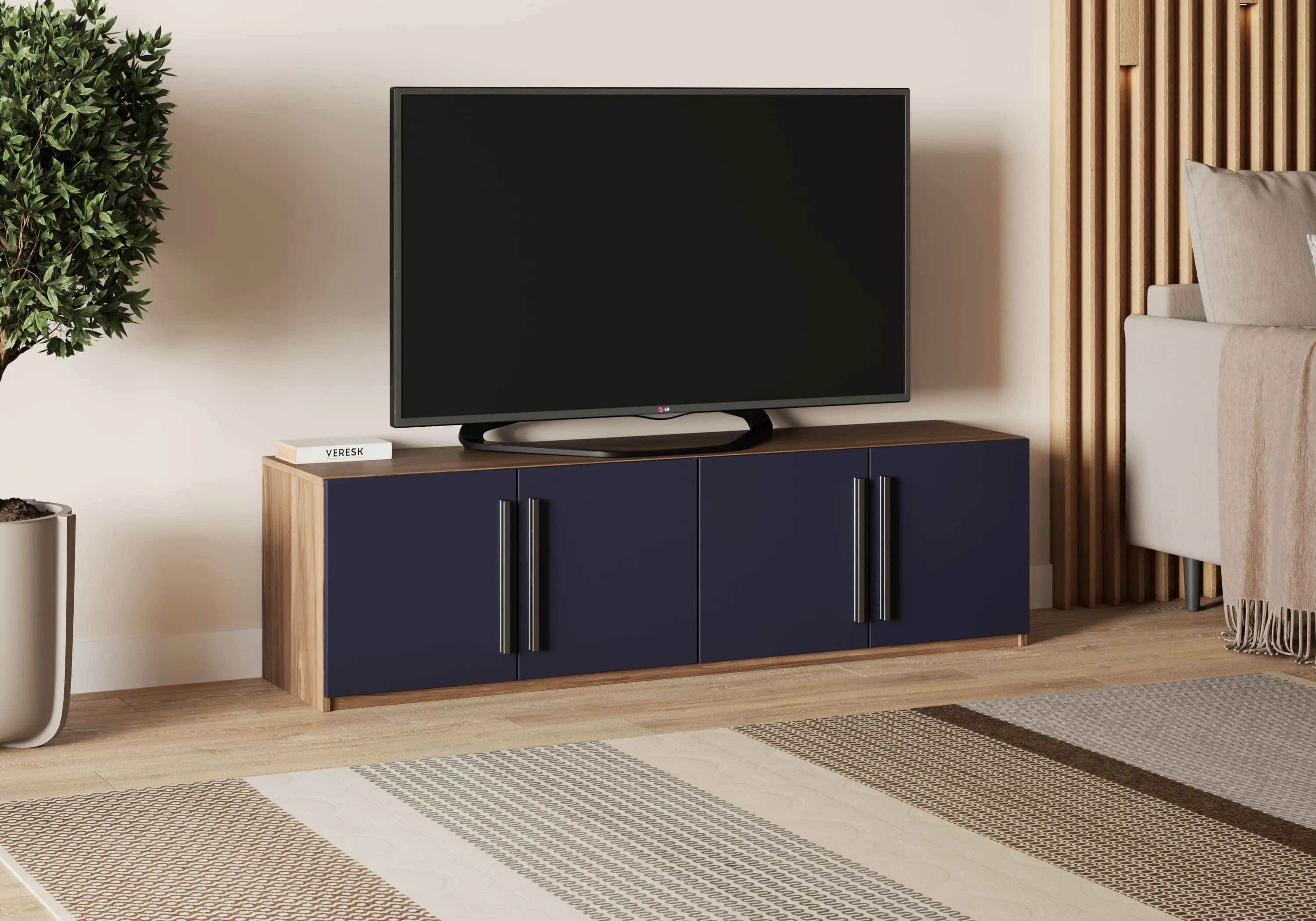 На верхней панели ТВ-тумбы можно свободно разместить телевизор, игровую приставку и умную колонку. Встроенные распашные отделения не ограничены разделителями, поэтому в них можно хранить крупную бытовую электронику, книги и другие вещи.