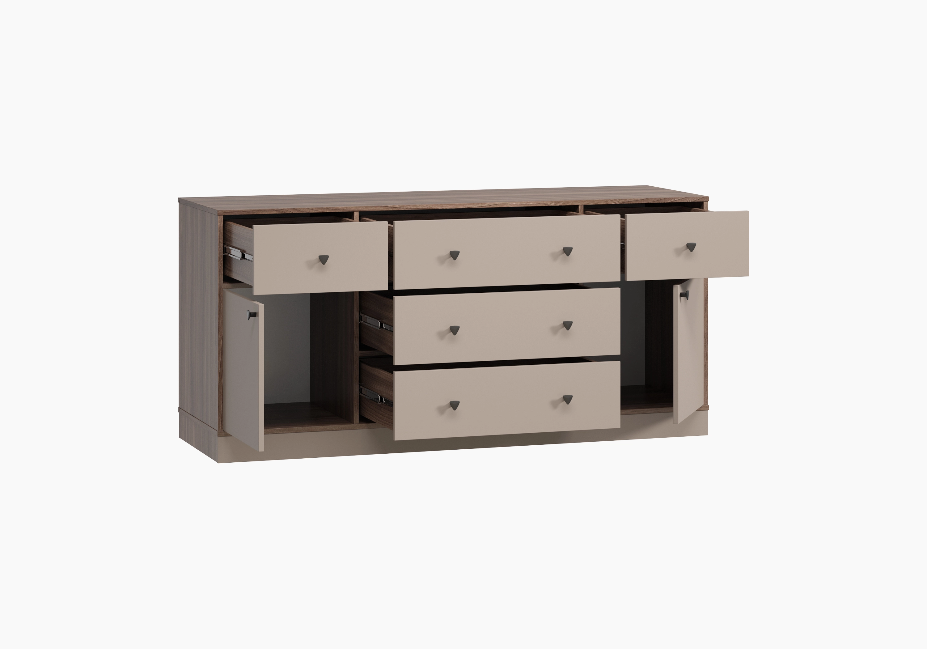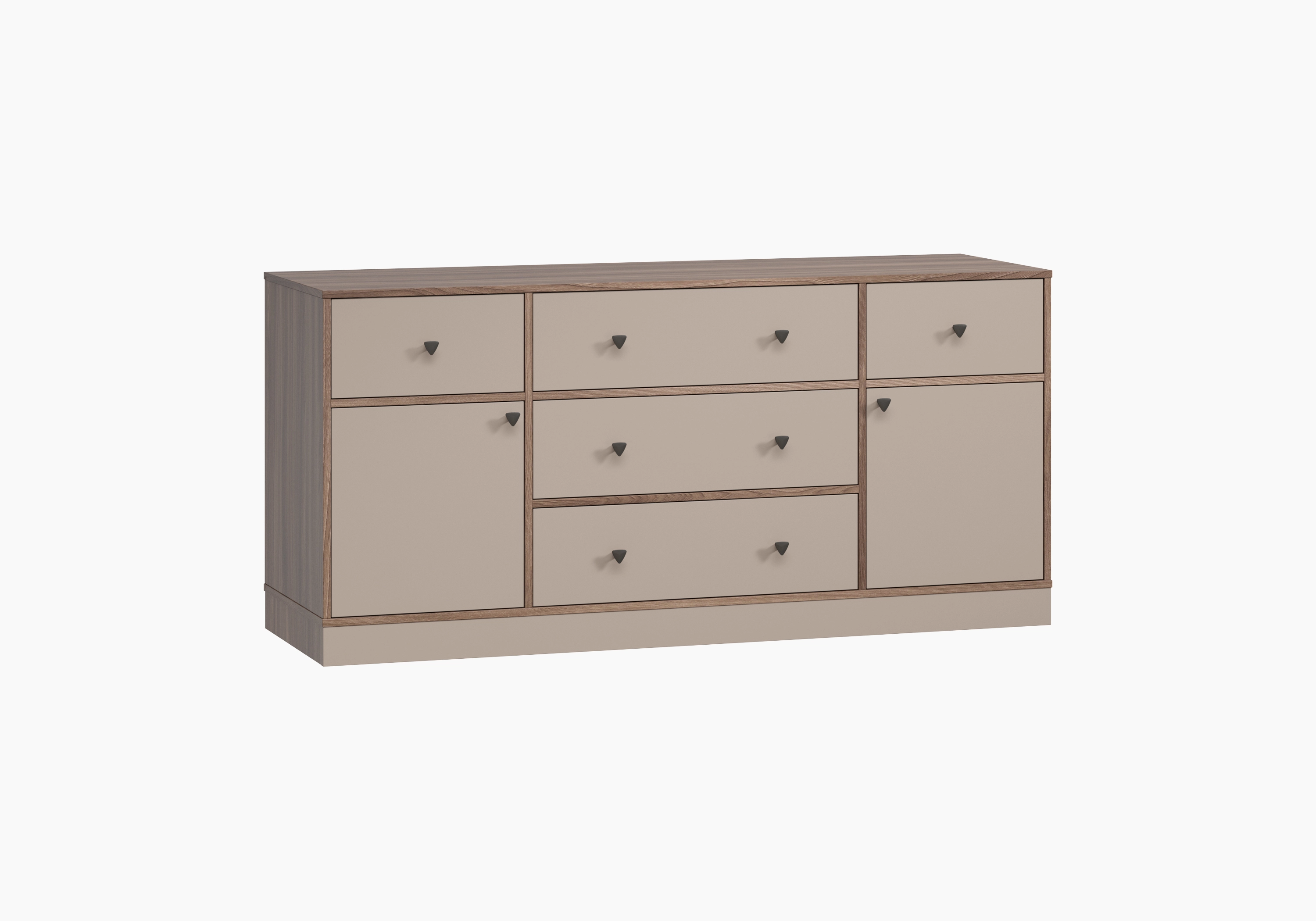 Треугольные металлические ручки представлены в трех вариантах: черный, хром и белый. Особенностью коллекции являются вкладные фасады. Антресольные дверцы открываются легким нажатием за счет системы push-to-open. Закрытый цоколь облегчает процесс уборки и делает мебель более устойчивой.