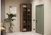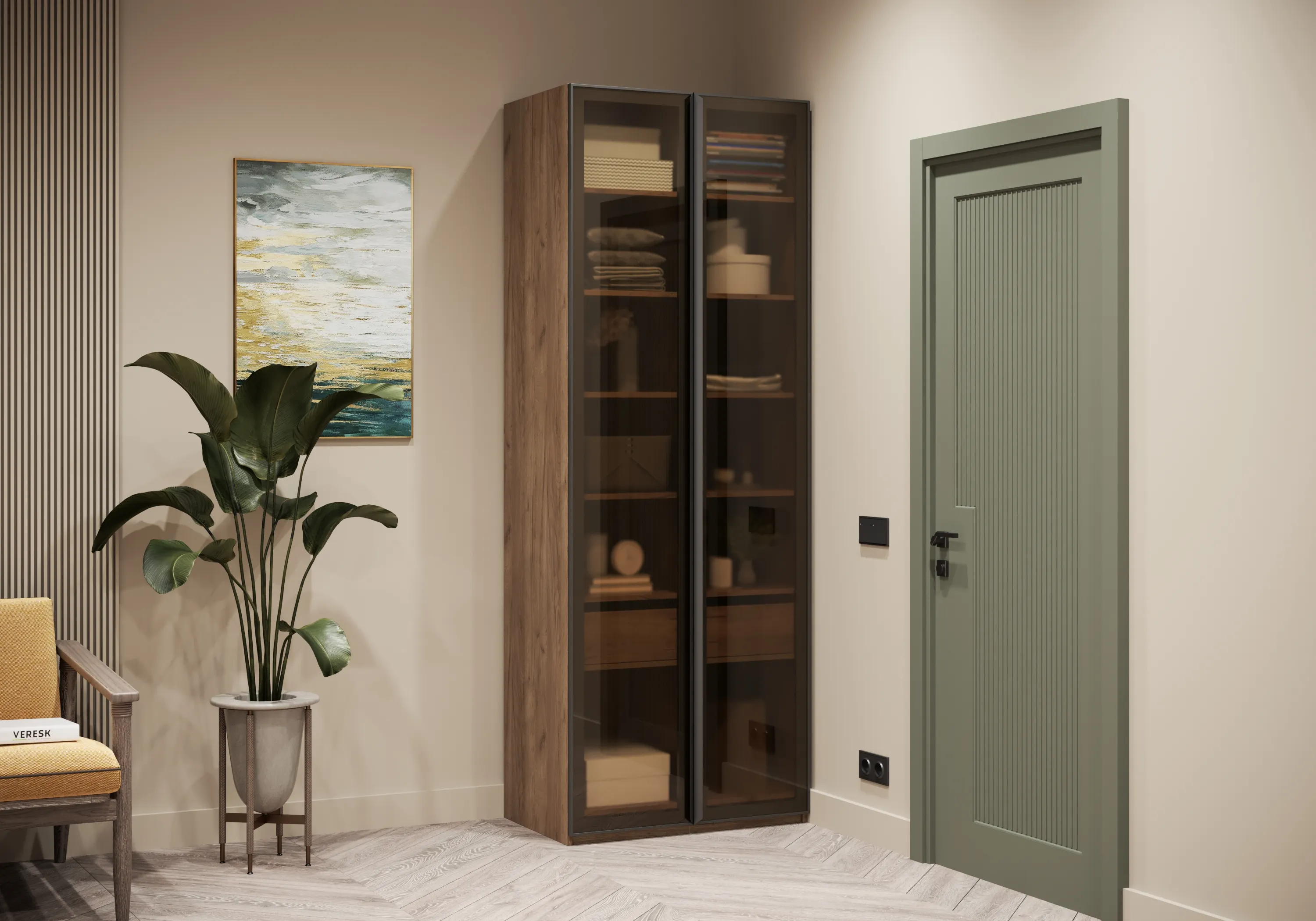 Двухдверная витрина оснащена распашными дверями со стеклянными вставками в элегантном черном матовом алюминиевом профиле Aristo. Накладные ручки Aristo Aspect тактильные и удобные в обхвате. Внутреннее пространство включает полки и два выдвижных ящика.