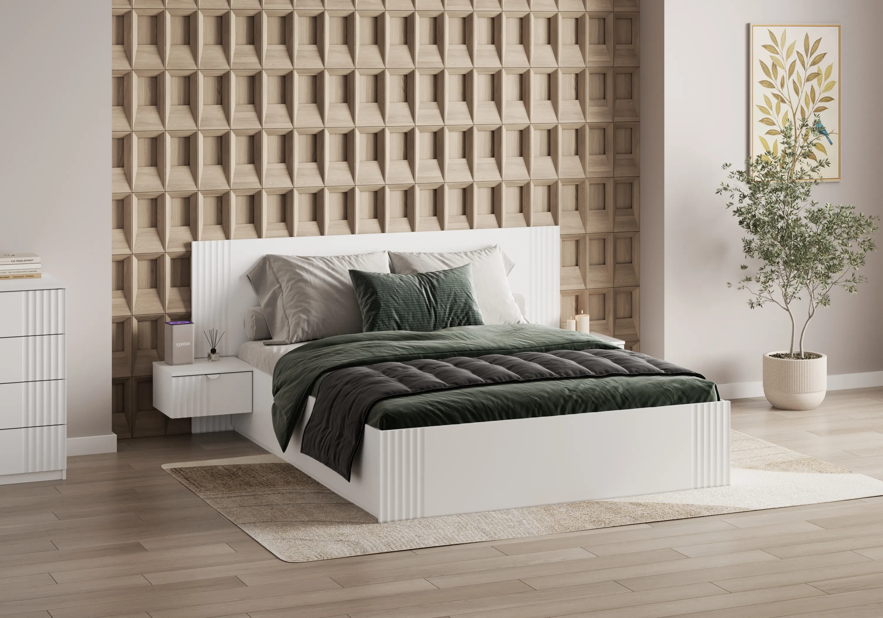 Легкое рифление лицевых фасадов комода, изголовья и изножья кровати придают живой объем спокойному минималистичному интерьеру.