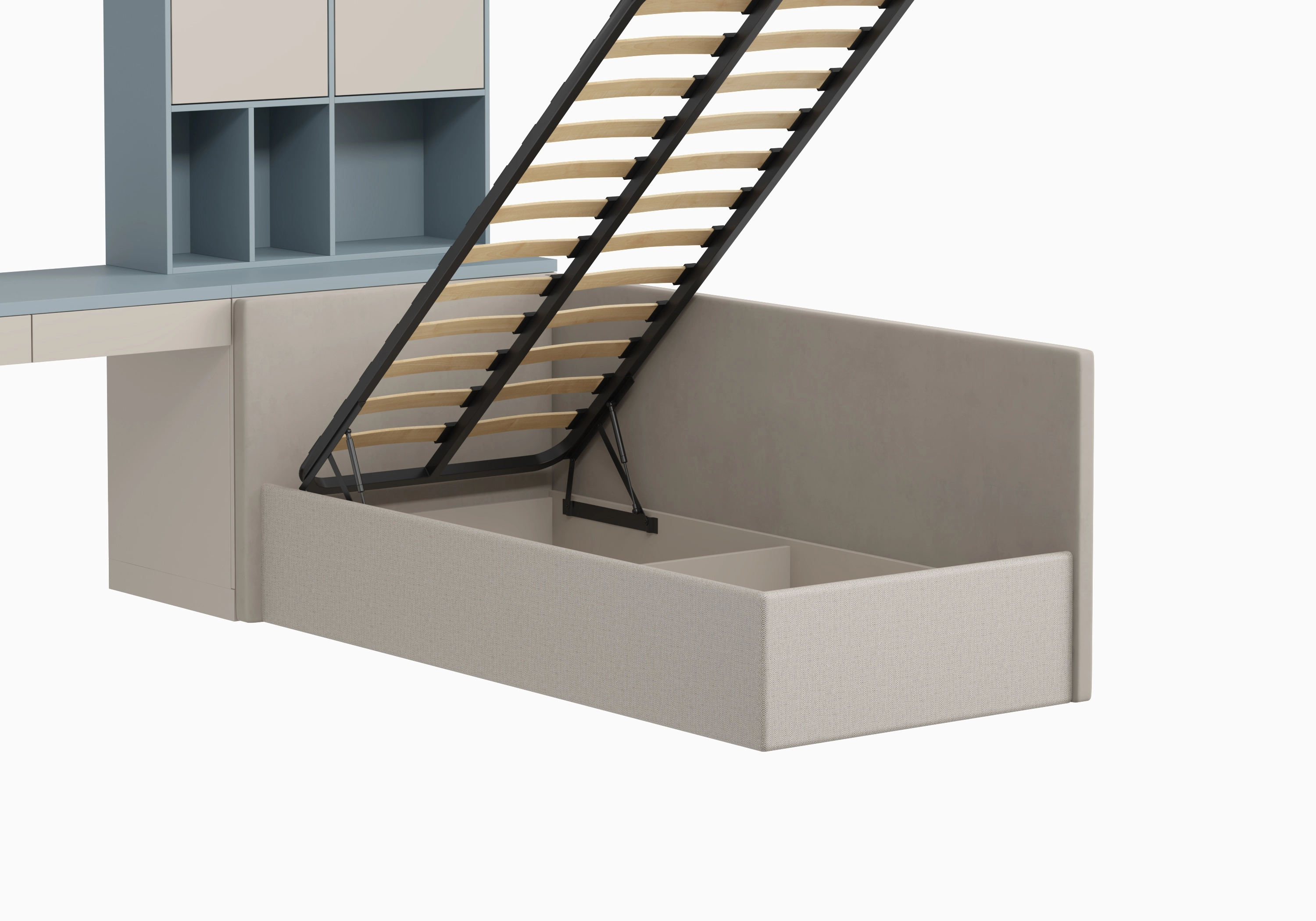 • Кровать с ортопедическим основанием и подъемным механизмом.