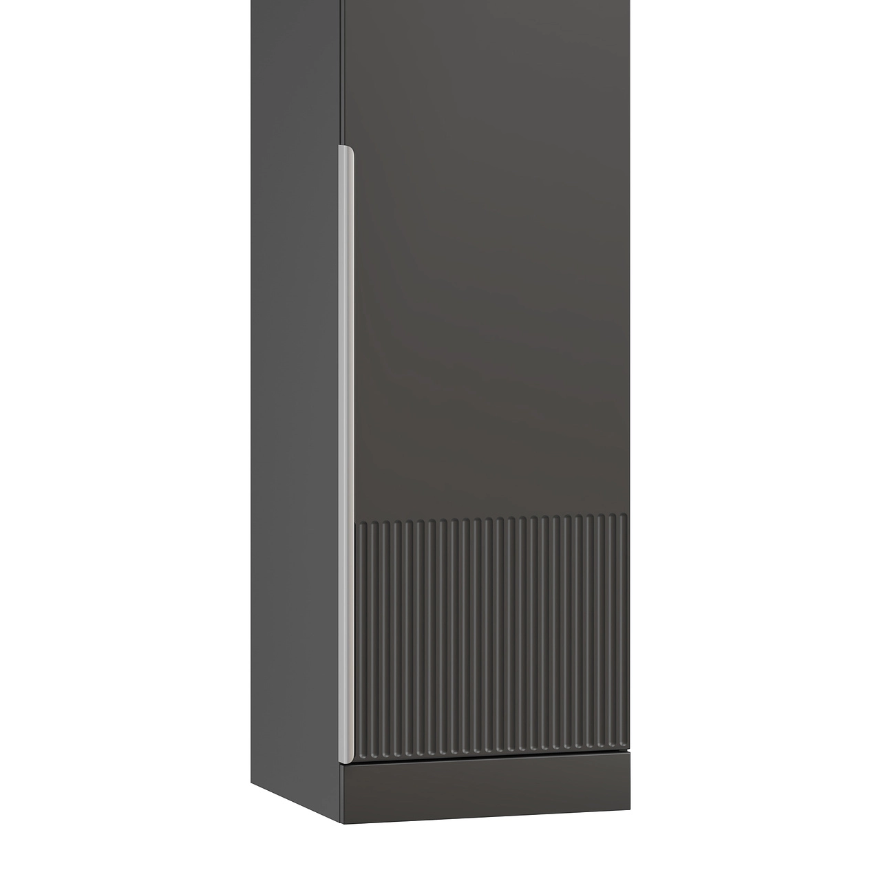 Однодверный шкаф состоит из трёх секций — платяного отделения со штангой и двух малых ниш. Антресоль оснащена системой push-to-open. Скрытое основание упрощает уборку. Также есть возможность добавить к комплектации выдвижные ящики, кронштейны, полки, зеркала, штанги.