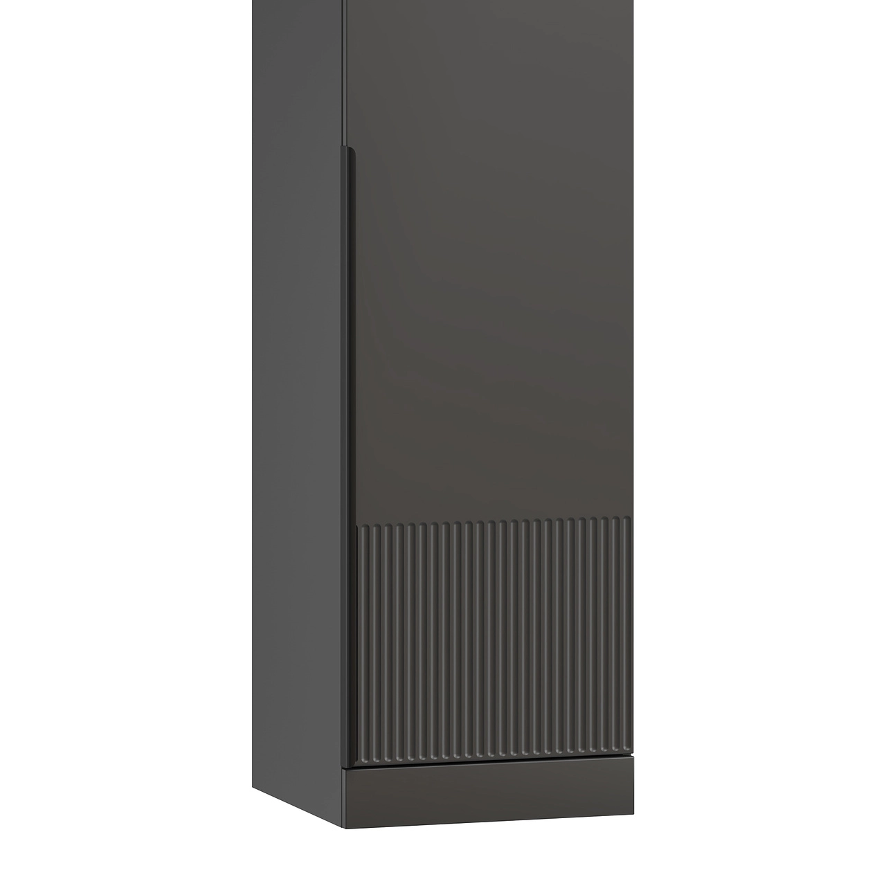 Нижняя часть фасада украшена фрезеровкой с волнистым рельефом — сочетание проверенной классики и свежих трендов. Черные металлические ручки-скобы создают выразительный контраст. Дверцы выполнены из надежного и влагостойкого МДФ в пленке ПВХ.