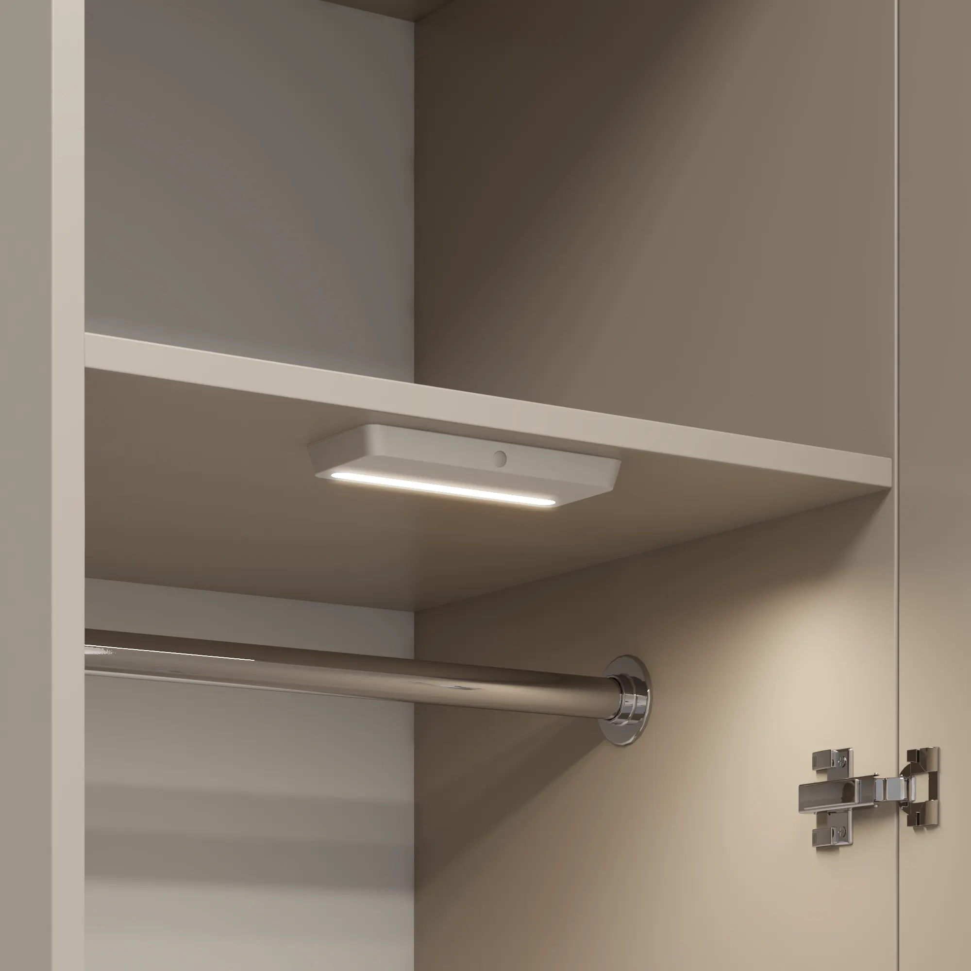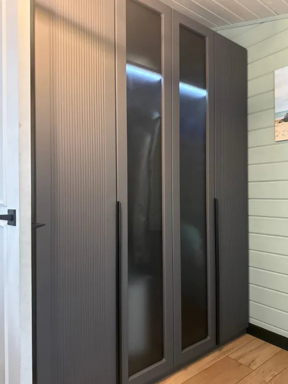 Фрезеровка, напоминающая рейки, приковывает взгляд и гармонично сочетается со стеклянными фасадами. Торцевые ручки представлены в трех вариантах: черная, белая и матовое золото. Внутри можно установить зеркала, блоки с ящиками, полки, выдвижной кронштейн, штанги, сетчатые полки для обуви, корзины для белья и светильники с датчиками движения.