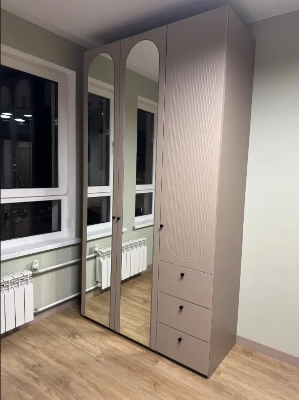 Зеркала, имитирующие форму арки, придают трехдверному шкафу легкость и гармонично завершают дизайн.