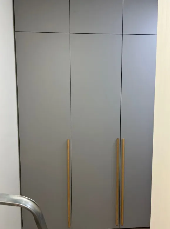 Вытянутые ручки из МДФ покрыты влагостойким лаком, надежно сохраняющим цвет. Закрытый цоколь облегчает уборку и делает конструкцию более устойчивой. В базовую комплектацию входят антресоль со встроенной системой push-to-open, платяное отделение со штангой, платяное отделение с двойной штангой и пять открытых секций. Есть возможность изменить конфигурацию: добавить внутрь выдвижные ящики и кронштейны, сетчатые полки под обувь, внутреннее зеркало, а также приставные элементы с открытыми нишами. Для большего удобства предусмотрены отверстия с шагом 128 мм для регулирования высоты полок.