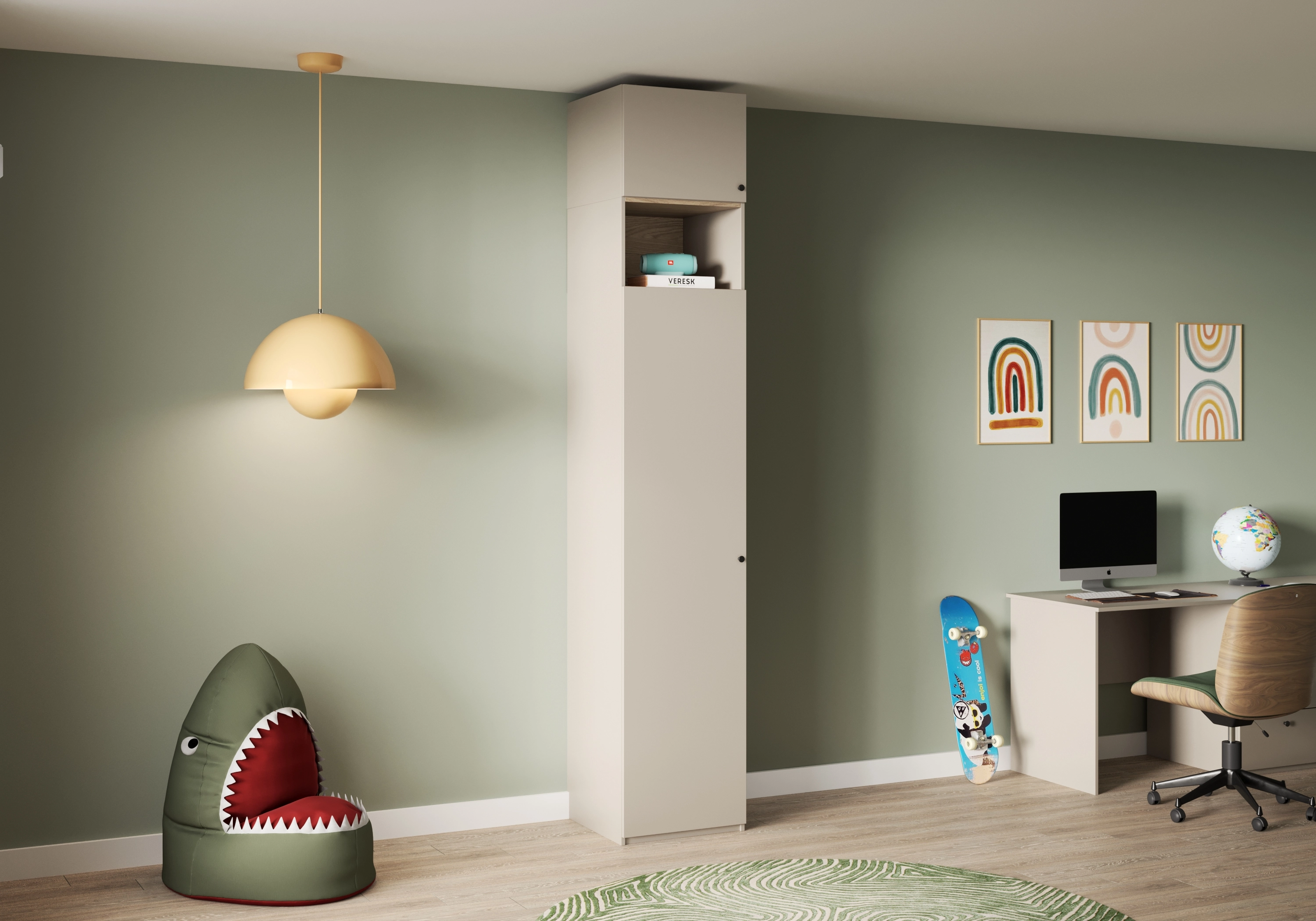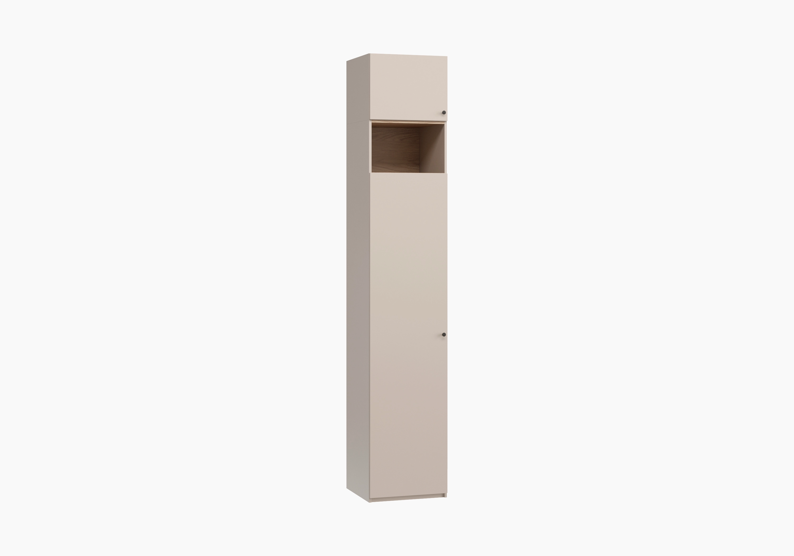 Ручки-кнопки не перегружают дизайн и удобны в захвате. На открытой нише и в антресоли можно разместить книги, элементы декора и другие важные мелочи. В распашном платяном отделении встроена крепкая штанга для вешалок. Закрытый цоколь облегчает уборку и делает конструкцию более устойчивой.