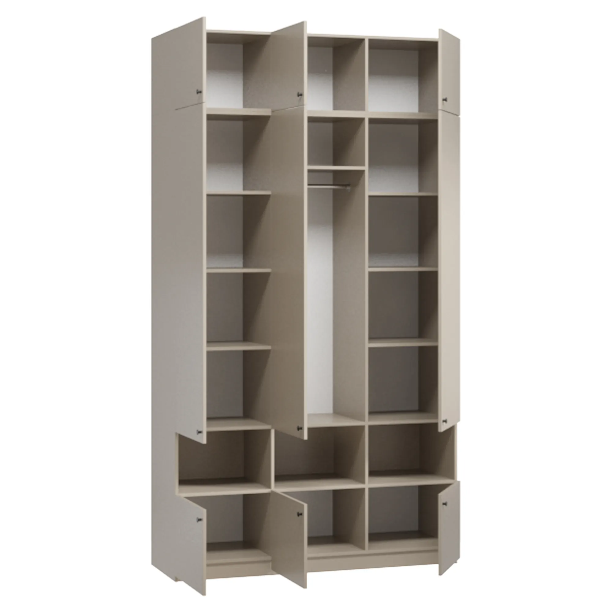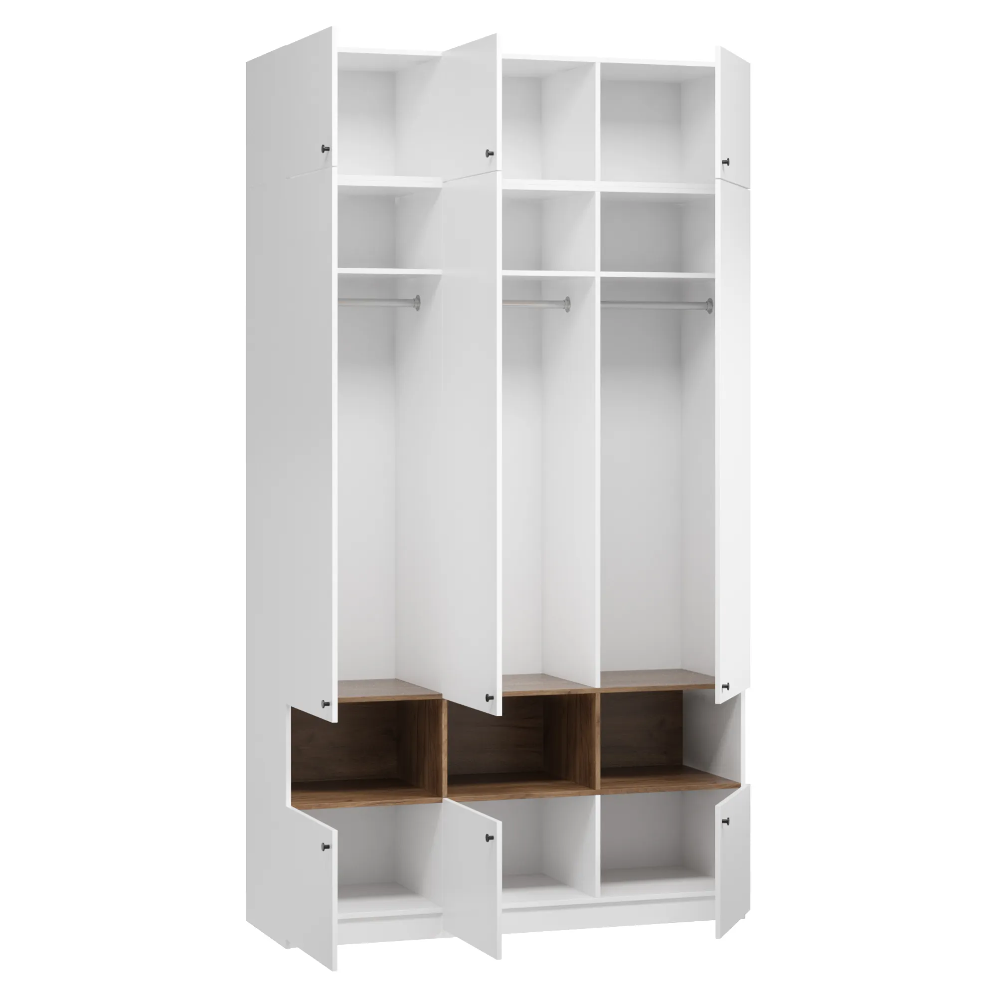 Ручки-кнопки не создают излишней сложности в дизайне и удобны в использовании. Для нужных мелочей и предметов декора предусмотрены открытые ниши. Комплекты постельного белья и сезонные вещи удобно расположить на верхних и нижних полках. В трех платяных отделениях встроены крепкие штанги для курток, костюмов и прочей повседневной одежды. Закрытое основание препятствует скапливанию пыли и облегчает процесс уборки.