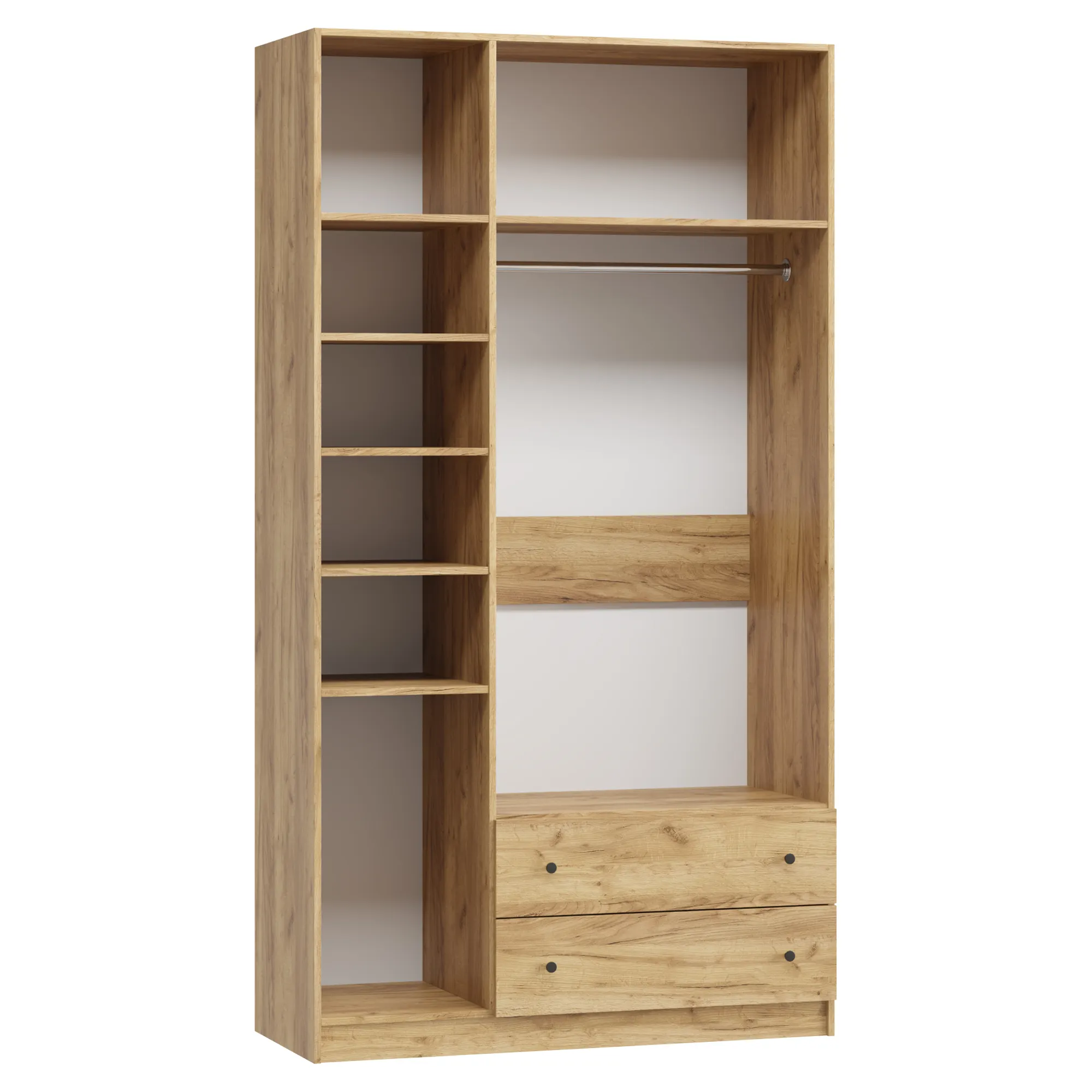 • При высоте 1800 мм в отделение Белье над ящиками устанавливается 3 полки; при высоте 1900 мм и 2000 мм - 4 полки; при высоте 2100 мм и выше - 5 полок.