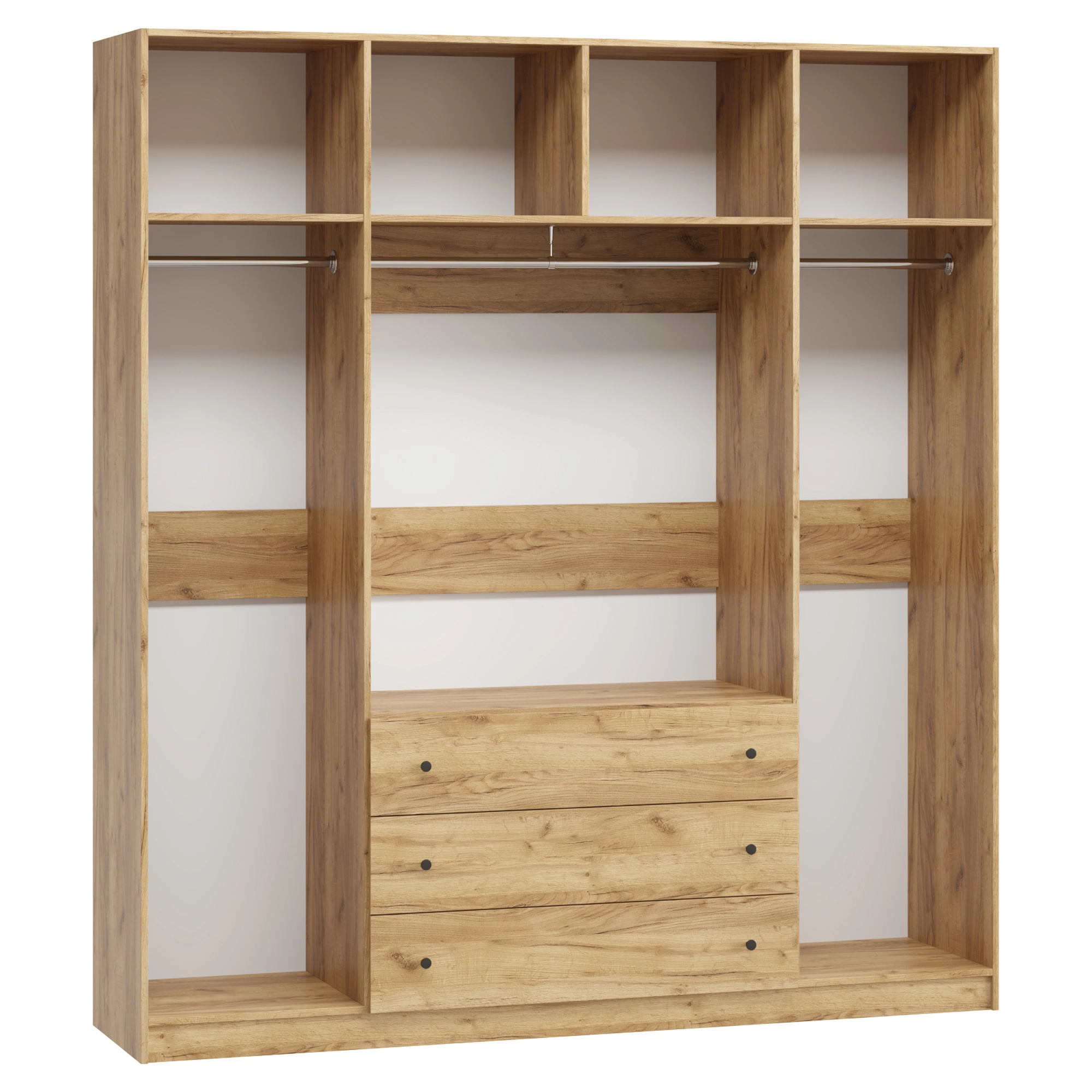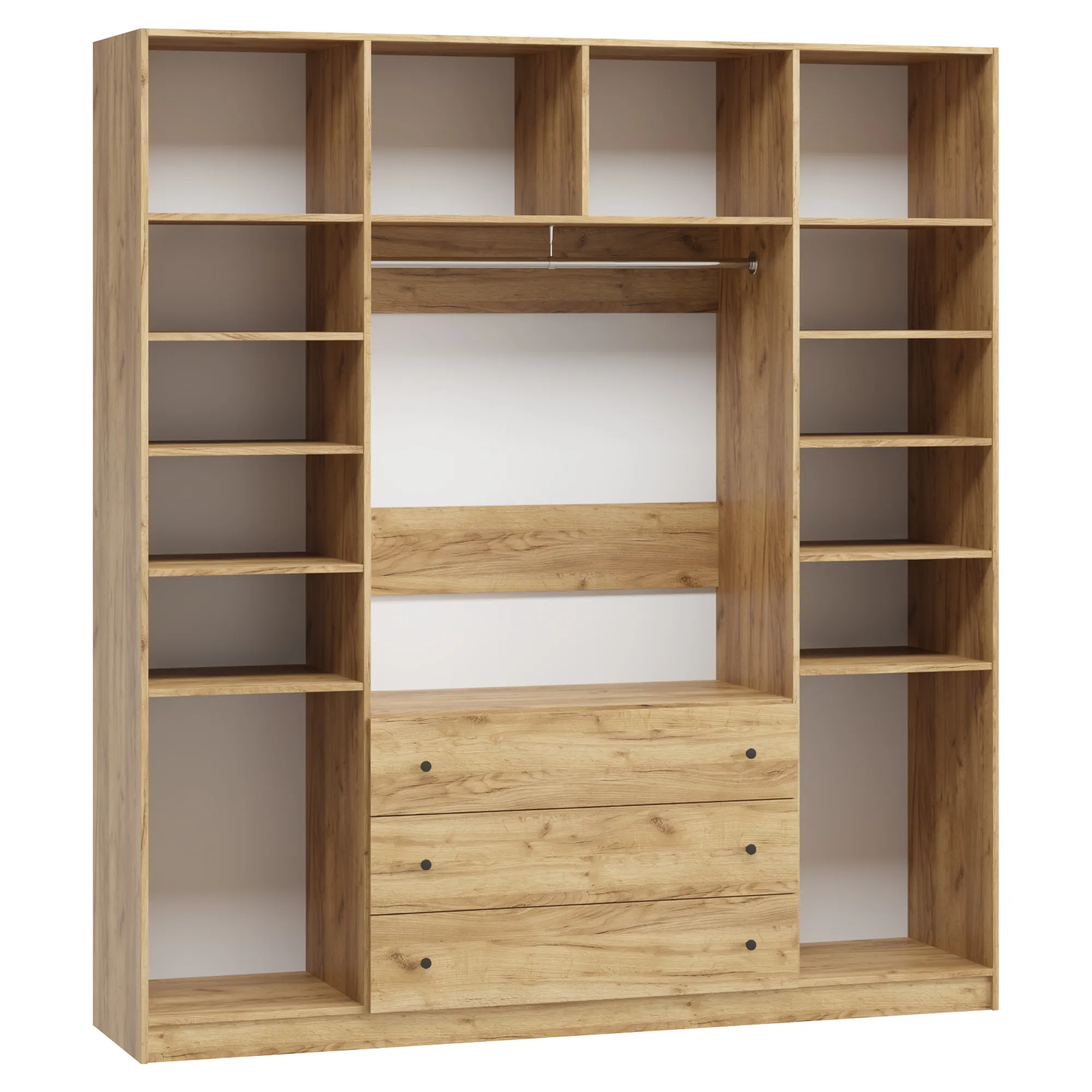 • При высоте от 1800 мм до 2000 мм в отделение Белье над ящиками устанавливается 3 полки; при высоте 2100 мм и 2200 мм - 4 полки; при высоте 2300 и выше - 5 полок.