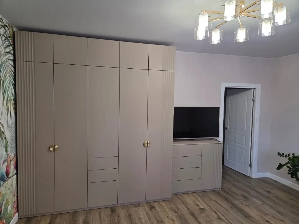 Декоративная фрезеровка подчеркивает выразительный дизайн корпусной мебели. Металлические ручки можно выбрать в золотом, белом или чёрном матовом оттенке.