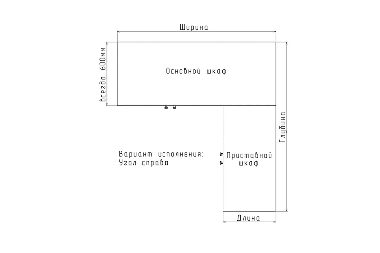 Наполнение в угловом отделении Основного шкафа не изменяется. Просвет верхней полки - 376 мм; просвет нижней полки - 300 мм.