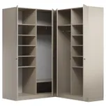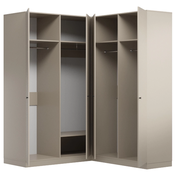 В платяных отделениях встроены штанги для платьев, пиджаков и курток. Для сумок, комплектов белья и коробок предусмотрены полки. Внутрь можно добавить светильник с датчиком движения, блоки с ящиками, сетчатые полки, выдвижной кронштейн и зеркала. Опция «выбрать вырез под плинтус» позволит придвинуть угловой шкаф плотно к стене.