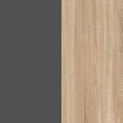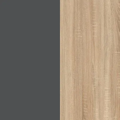 Корпус и выдвижные ящики, расположенные в нижней части шкафа выполнены в оттенке Дуб Сонома. Фасады исполнены в темно-сером цвете, одним из самых трендовых в настоящее время. Ручки на дверцах и выдвижных ящиках выполнены из МДФ с фрезеровкой и исполнены в цвет корпуса.