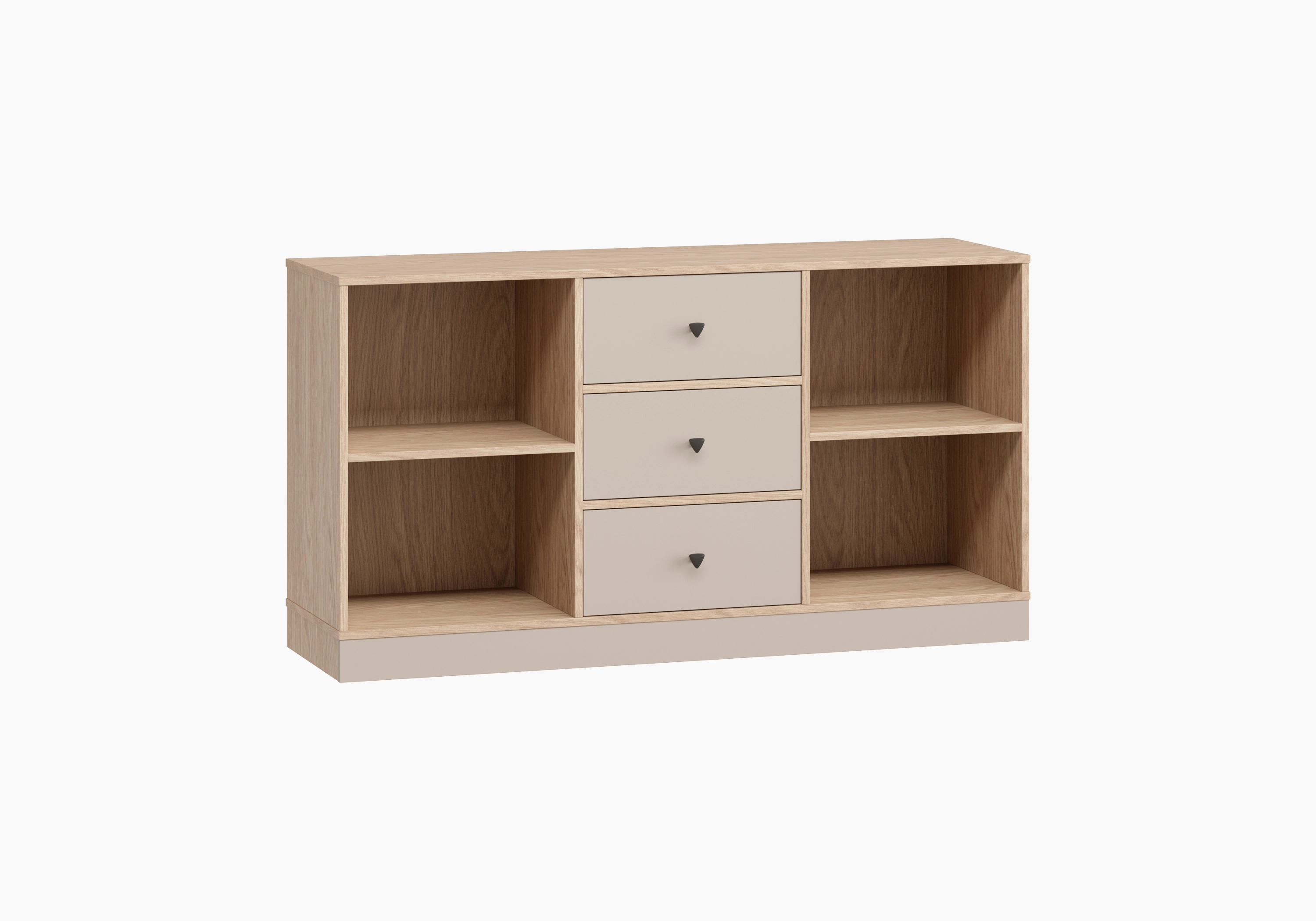 Шариковые направляющие гарантируют плавное и бесшумное закрывание. Зарядные устройства, бытовая электроника и иные нужные мелочи можно распределить по открытым полкам и выдвижным ящикам. Закрытый цоколь облегчает уборку и придает устойчивости конструкции.