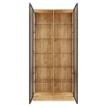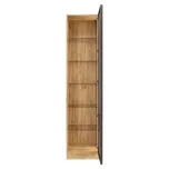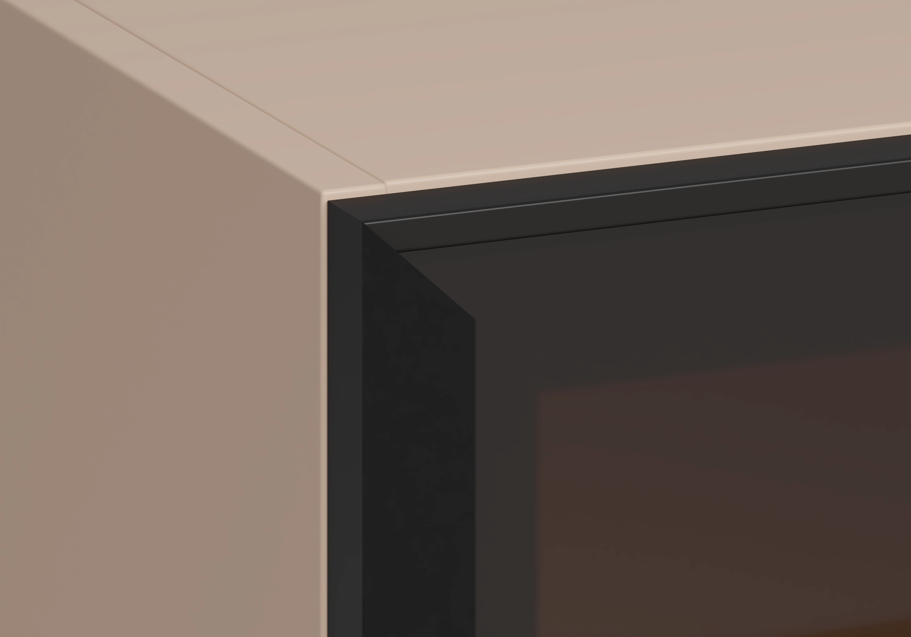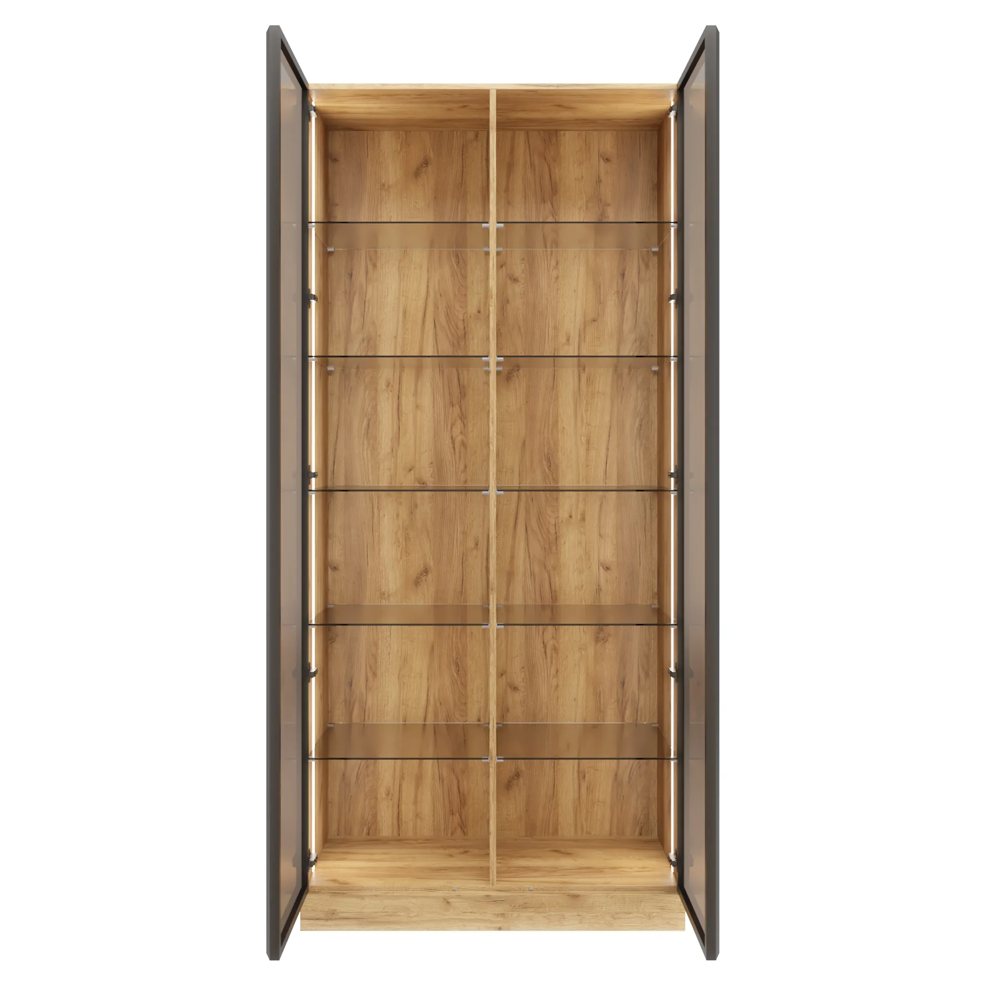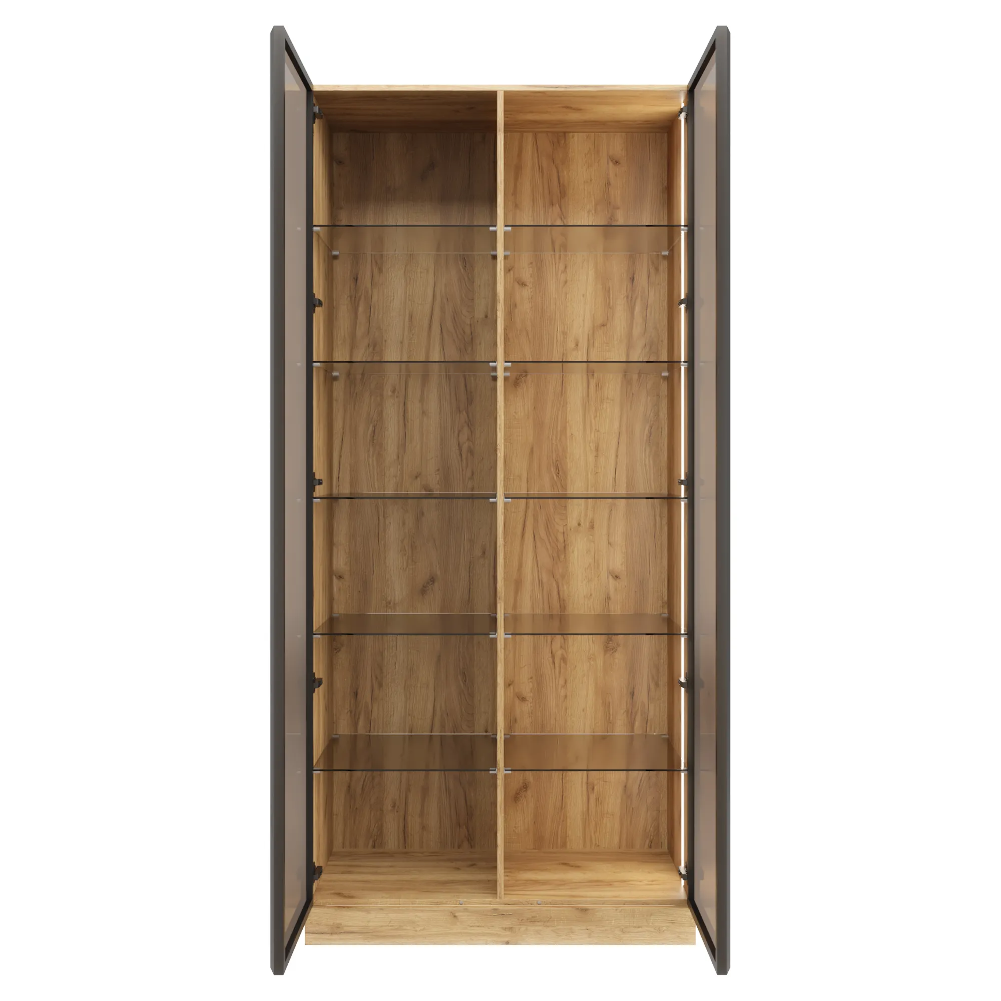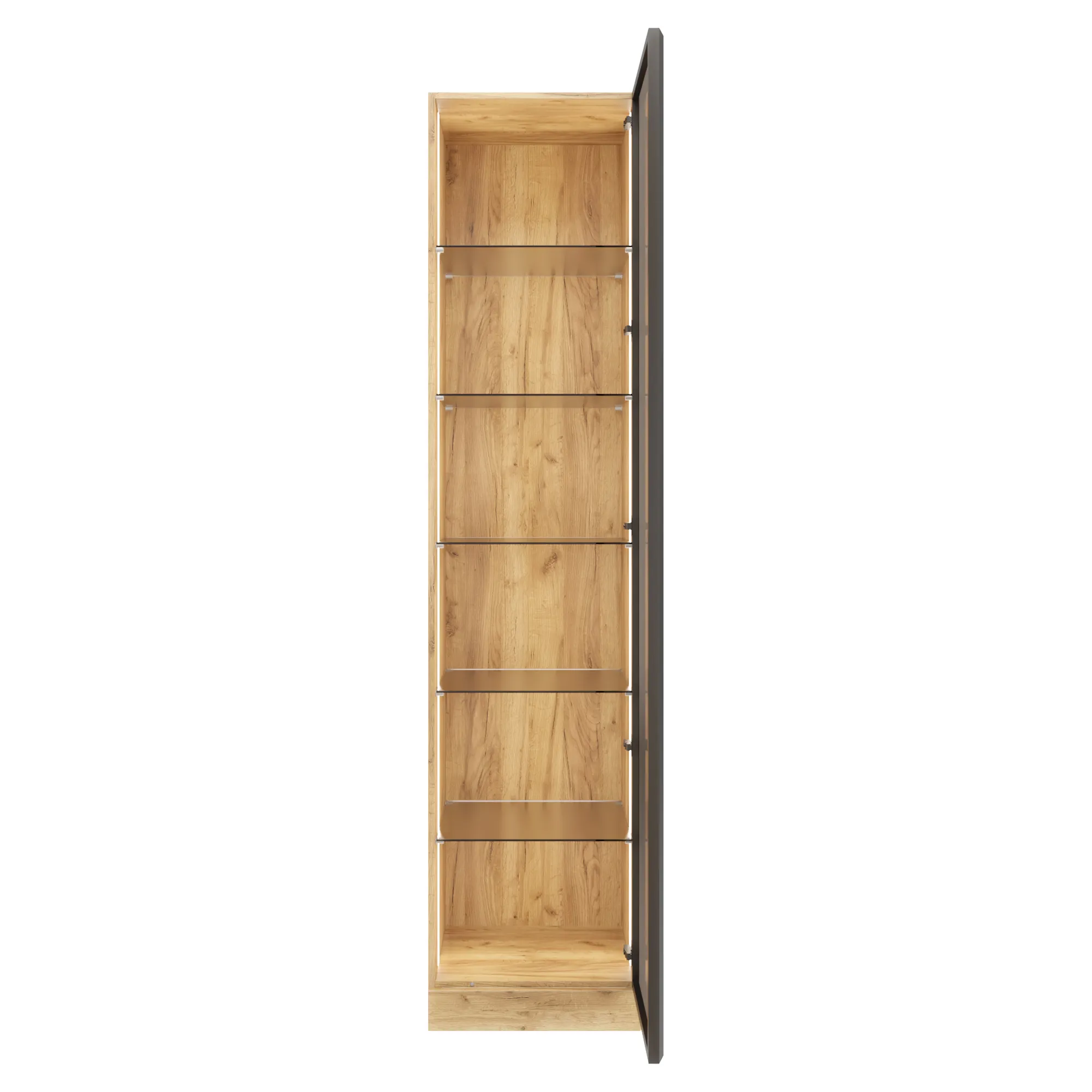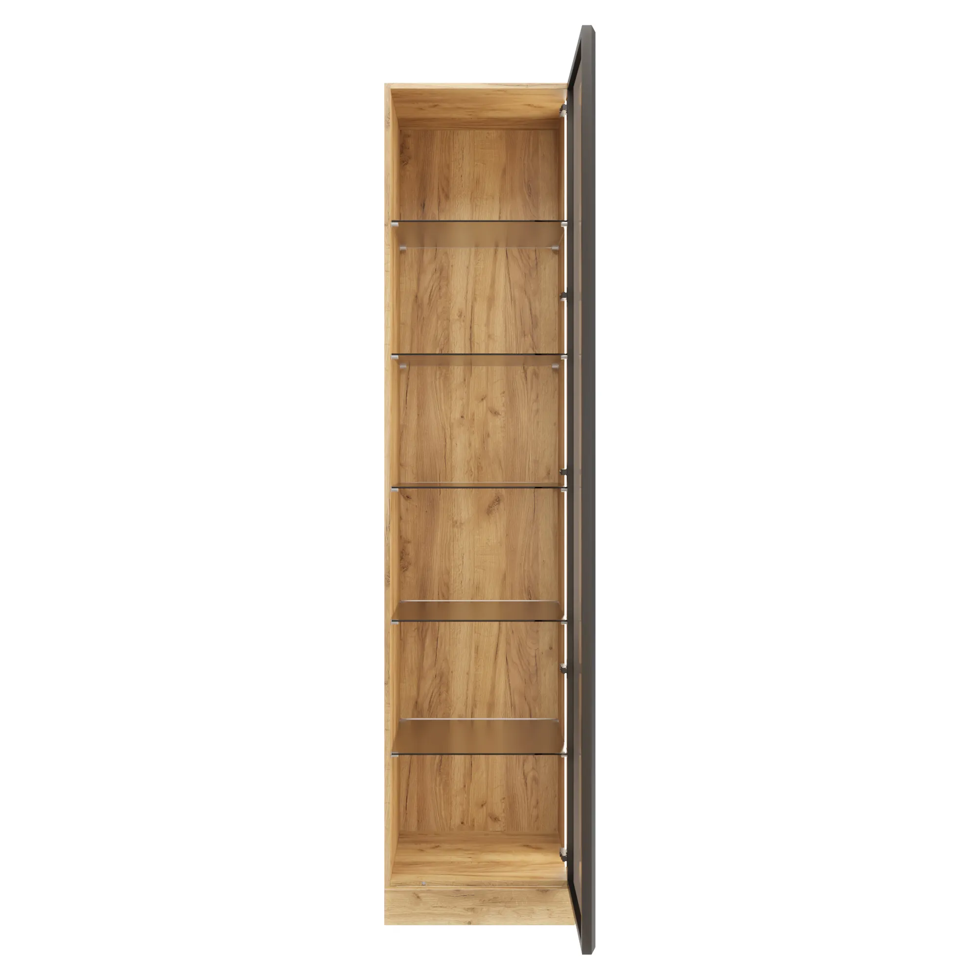 Фасад декорирован цветным стеклом в приглушенном черном оттенке. По периметру его дополняют узкие рамки Al LINEA. Внутри двухдверной витрины предусмотрены два отделения с полками по всей высоте изделия. Бесшумное открывание и закрывание двери обеспечивают специальные петли HARMONY с доводчиком.