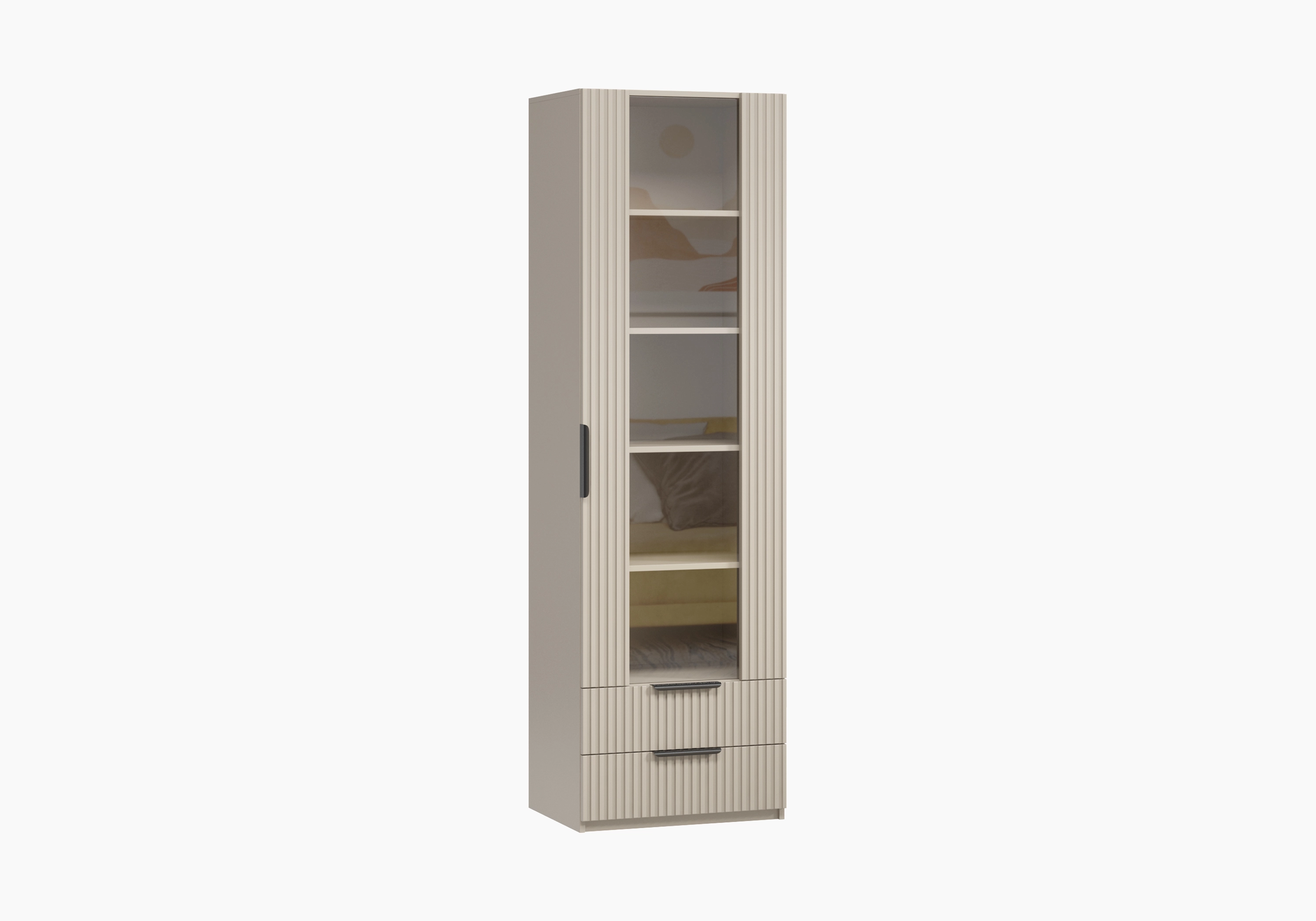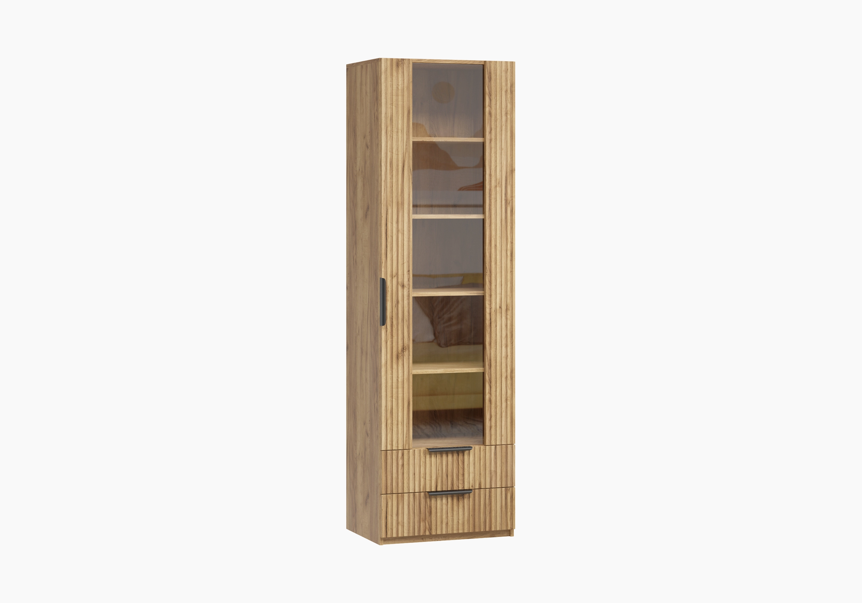 Торцевая ручка удобна в использовании и защищена от коррозии. Фрезерованную дверцу украшает стеклянная вставка, позволяющая демонстрировать содержимое полок. Два дополнительных ящика у основания конструкции оснащены шариковыми направляющими, которые способствуют бесшумному и плотному закрыванию.